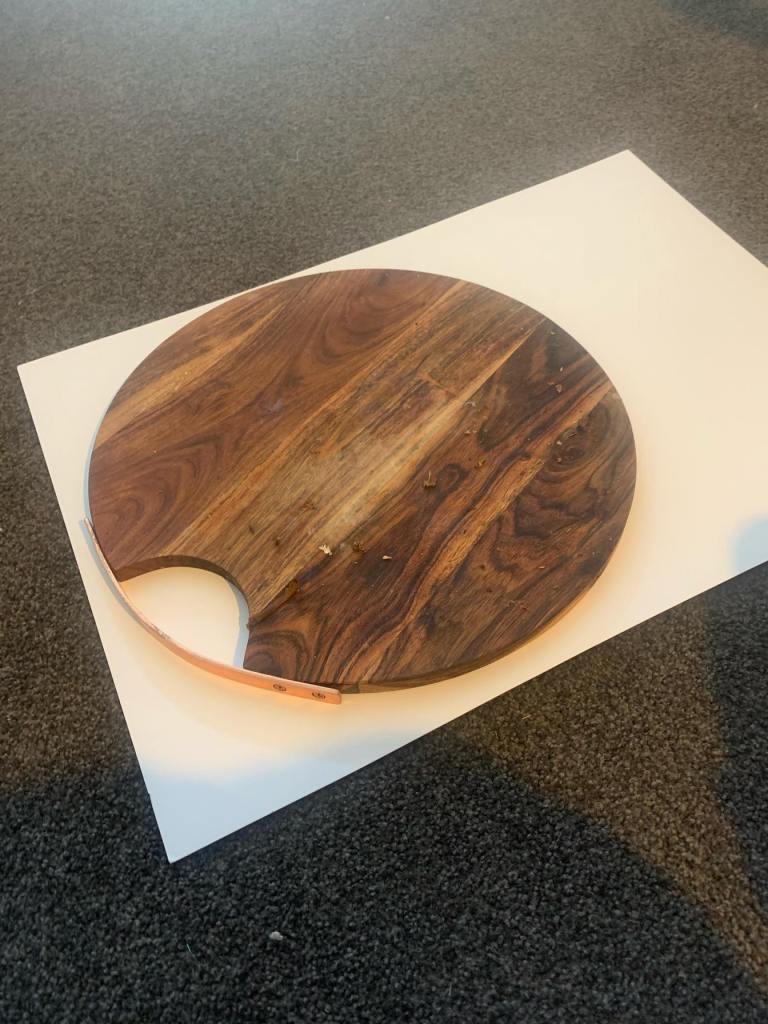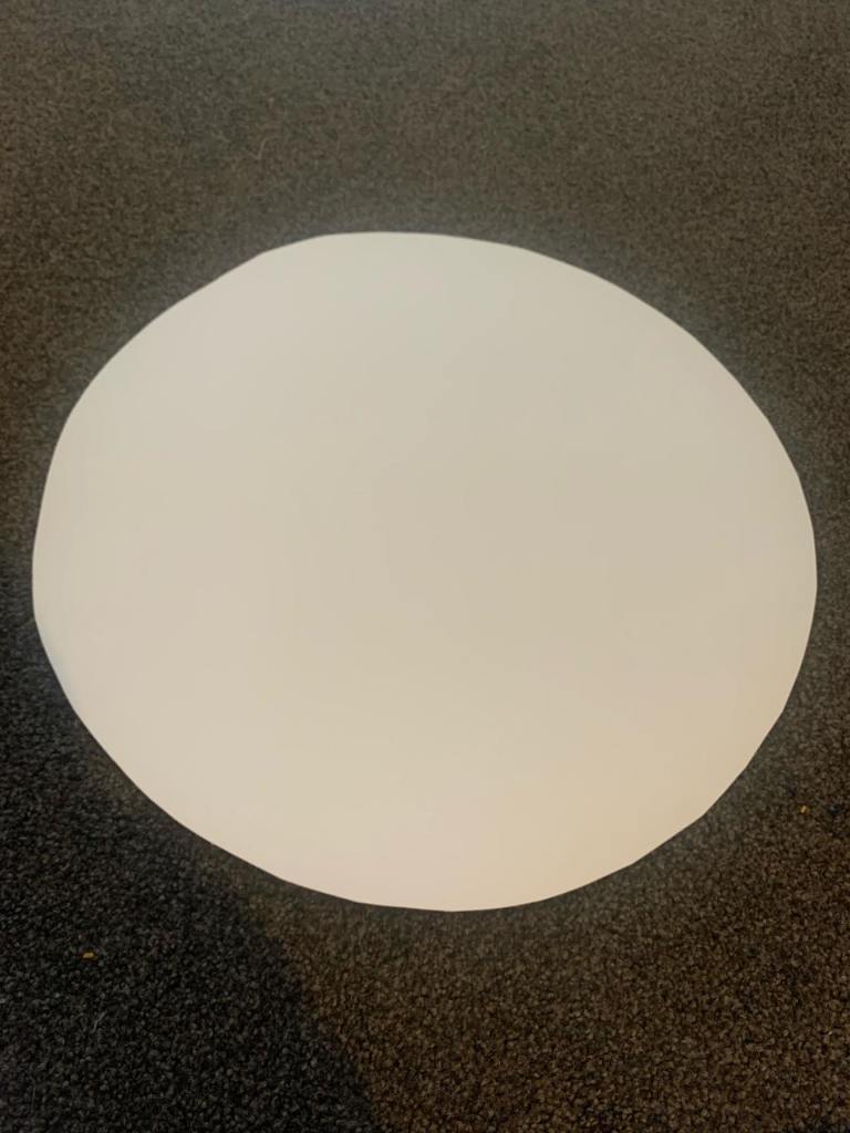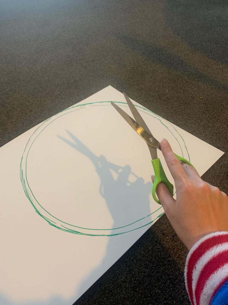 Find something large and circular lying around your home. For me it was a chopping board. Place this on the slightly thicker card and trace around it using the vivid. Cut out traced circle and put your chopping board back in the kitchen.