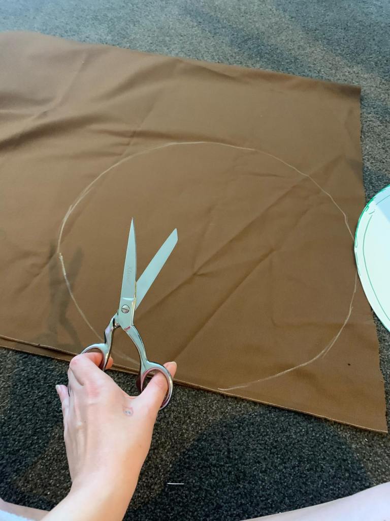 Cover the bottom of the hat brim in glue and place on top of one of the fabric circles. Trying your best to place it in the center which should hopefully give you about a inch fabric allowance around the edge.