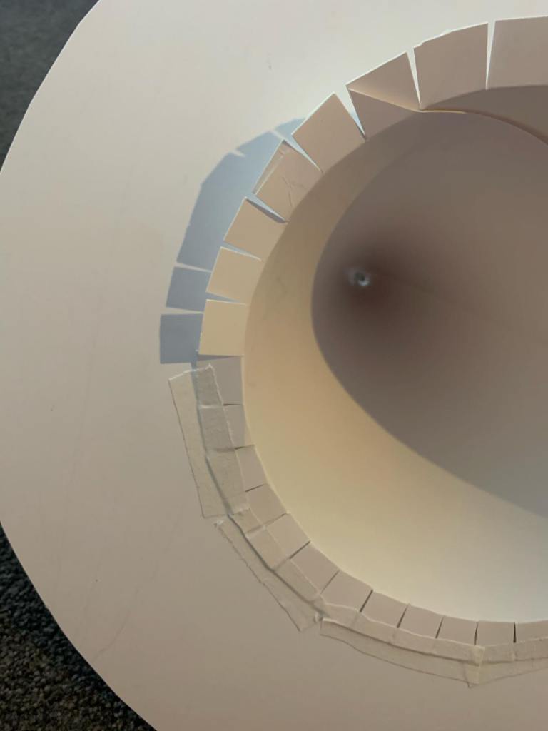 You then want to place this cone in the center of the circle you’ve made and let it unroll itself a little so that it fits tightly against the circles edge. Tape the cone so that it doesn’t unroll once removed.