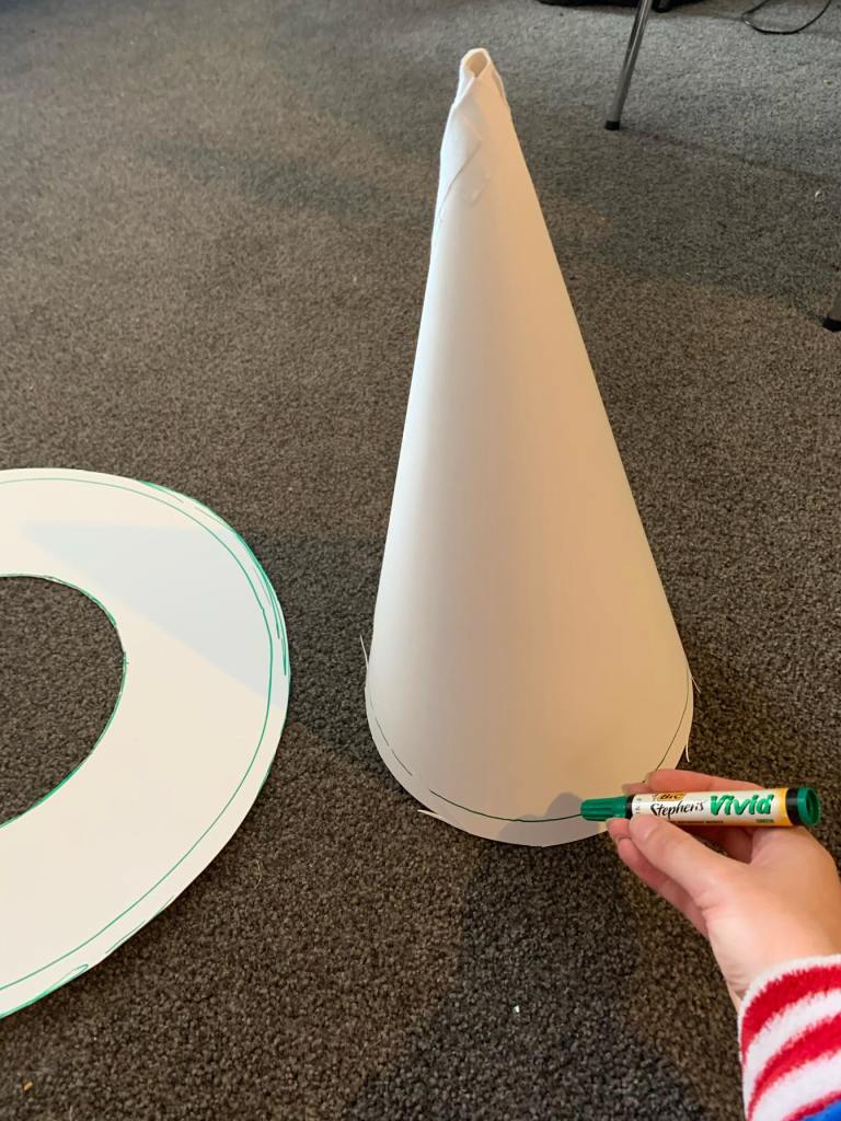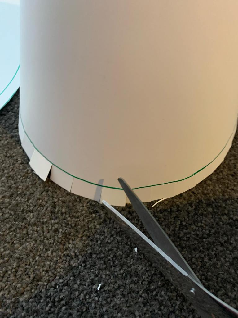 Take the cone out and cut the excess off along the bottom edge about half an inch away from the line you drew.