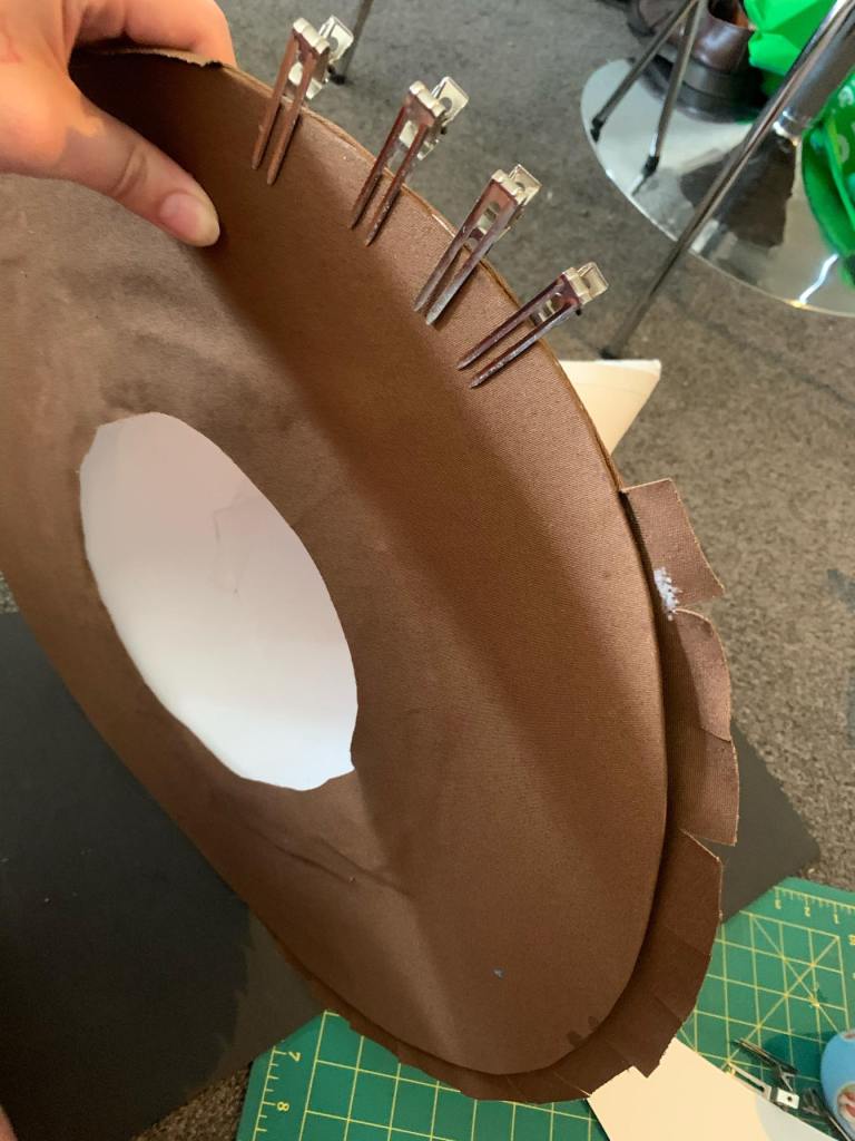 Cut little tabs along the allowance of the fabric again (the bit that’s overhanging the edge). Now on the brim, you want to paint a bit of glue, then lift and fold the tab underneath itself. Place a clip to hold in place if needed.