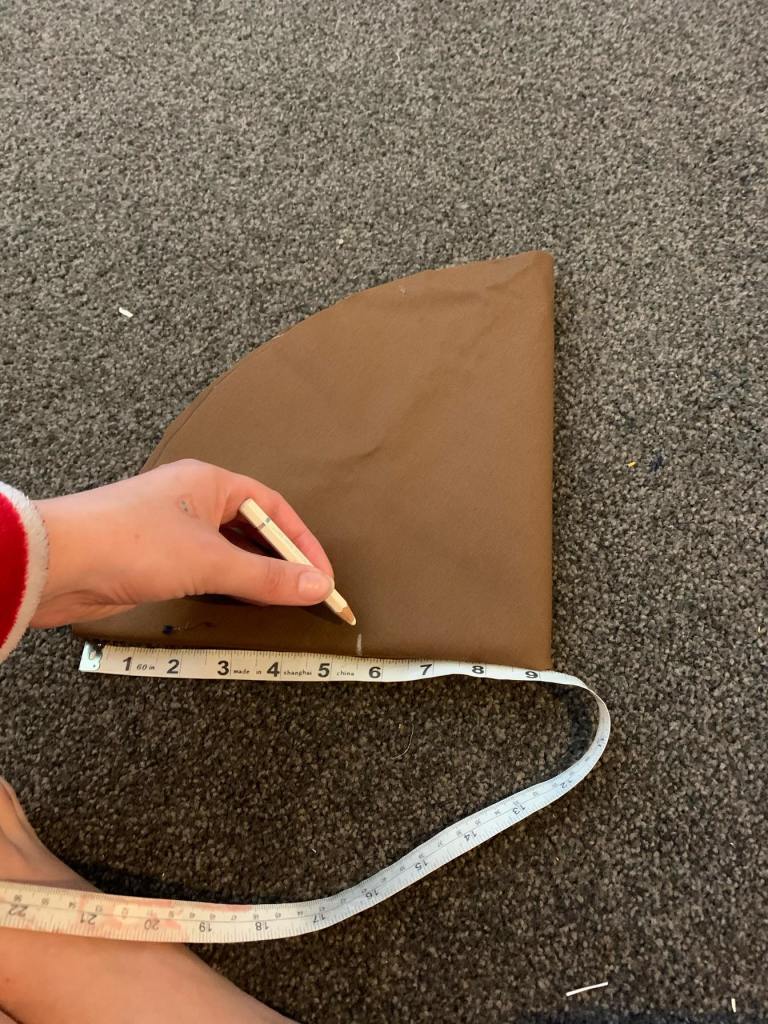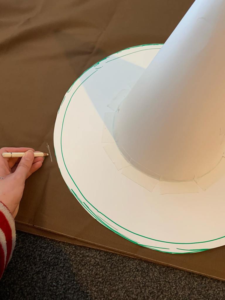 You want to cut a triangle shaped piece of fabric that will cover your hats cone entirely. Leave room at the back to add a seam.