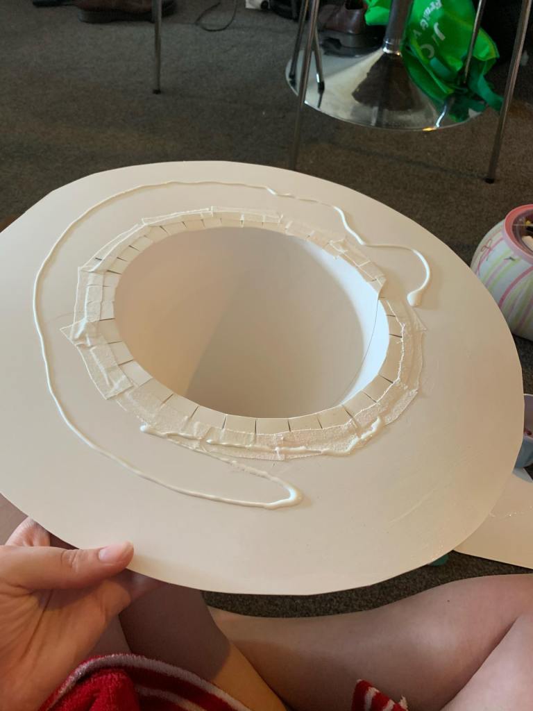 Cover the top part of the brim in glue leaving about a 1.5 inch gap from the brims edge. Place your other fabric circle on top of this.