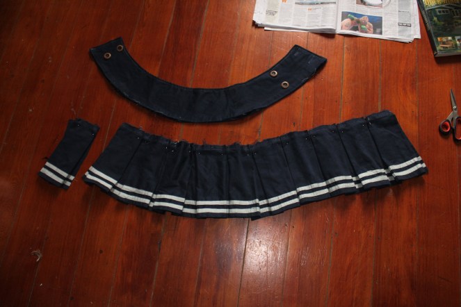 5. A sailor collar made from grey poly cotton and navy bias for the stripes was drafted and added by my mum.