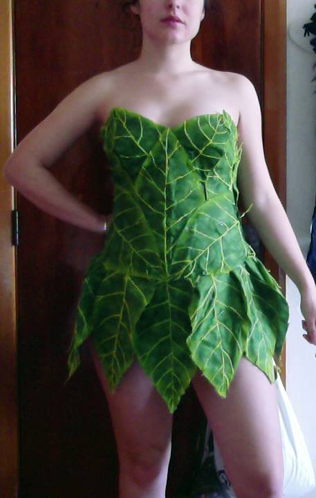 Bodysuit : Made using Kwik Sew K3052. I made it from a light green spandex which I painted veins on using acrylic paint. I cut the neckline and the sleeves hems jagged to mimic the look of a leafs edge.