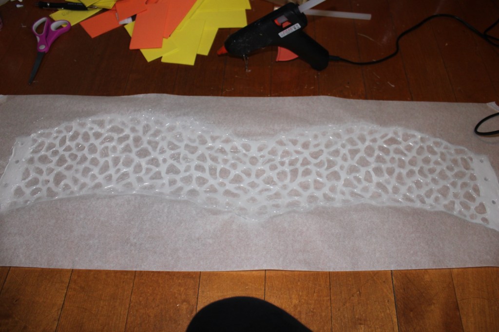 For the shoulder pieces and belt, I made them from hot glue. I printed some templates I found online made by Yleniamanganelli, to my size, covered them with baking paper and traced over the design with hot glue. Once to glue had cooled, I painted the pieces with gold spray paint.
