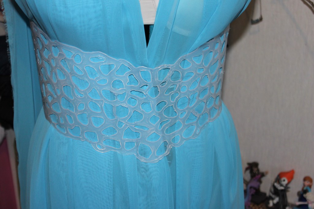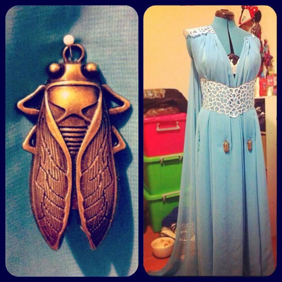 The beads on the front of the dress were just a collection I found from a variety of different craft stores. Though I did shell out for the screen accurate cicada ones which I found on Etsy at the time. The beads were all strung together using gold wire and hung from the front of the gold belt.