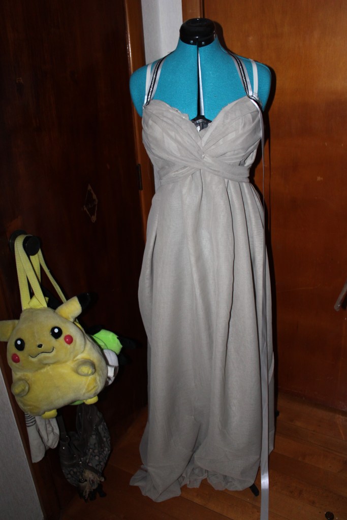 As I said before, I was asked to commission this dress for $100 which meant I had to be very frugal with my fabric choices. Luckily at my local emporium store, I came across this grey/beige sheer fabric in the curtaining section and it was all of $2 a meter. I grabbed several meters of it and some ribbons that I’d use in place of the metal braid for the armbands and halter neck.