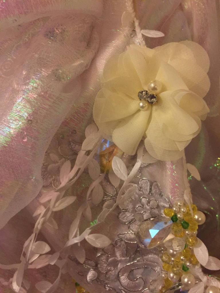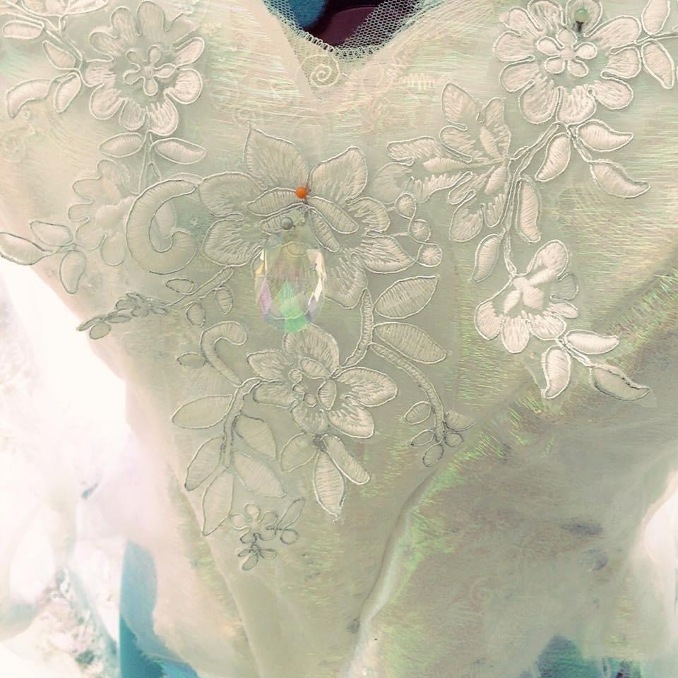 So when remaking them I decided to leave six inches open at the wrist and to add three pearl buttons so they could be opened and closed. I also decided to use the scalloped edge of the tulle this time. Originally, I was going to add motifs to the cuff to match the ones on the breast, but it just looked bulky and out of place, so using the scalloped edge of the tulle, gave it a beautiful but delicate edge to the cuffs. Also during the second remake, I used the fray check at every possible moment again. Fist when overlocking the organza, then when attaching it to the tulle. And once again, it stopped the fraying for the most part.