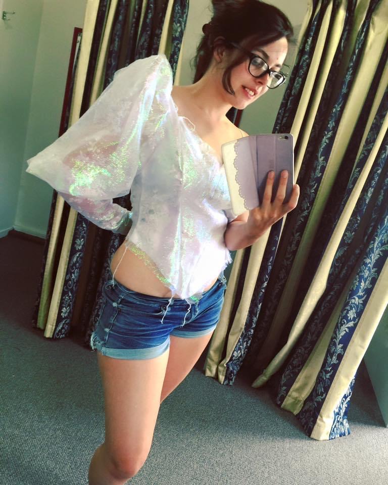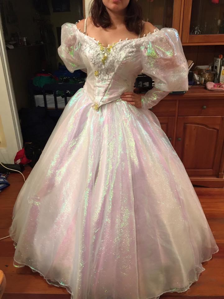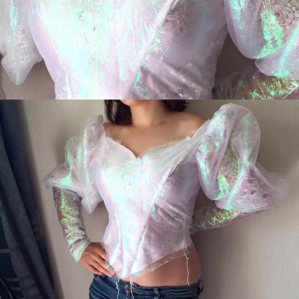 I refused to change it out for something else as it was far too pretty and gave me all the iridescent sparkle I was after so I posted my frustrations about working with said devil fabric to Facebook. That’s where I received a life changing pro tip from Kathy of Cubefrau Cosplay. Fray Check. Itโs basically a glue that you put on seams (or fabric in general) and it stops the edges from fraying. I ran it down all my seams in the bodice, however, the ones in the back were beyond saving so I removed the organza layer entirely. This meant I had to cut out two new panels entirely, so I did and overlocked them first then applied fray check to the edges. Once it had dried, I appliquรฉd the new panels over the top of the tulle and satin ones on the back and fray checked again. (And if I were to remake this costume again, thatโs how I would attach the organza everywhere as after wearing it for two days, this was the area that held up the best with the least amount of fraying.)