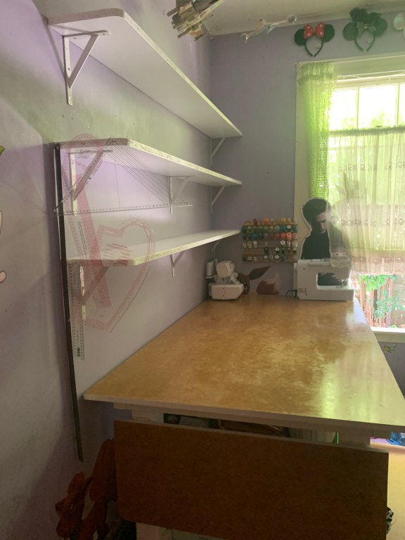 Speaking of which, I finally put up the last set of shelves in my room and was able to get rid of the book shelves that were sitting on top of my table. There is so much more room now and I’m able to roll out entire bolts of fabric with ease. I also added a magnetic knife rack (missing from the photo below) above the thread holder as a place to hold my scissors. It works wonderfully.