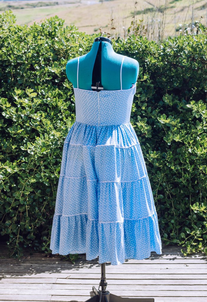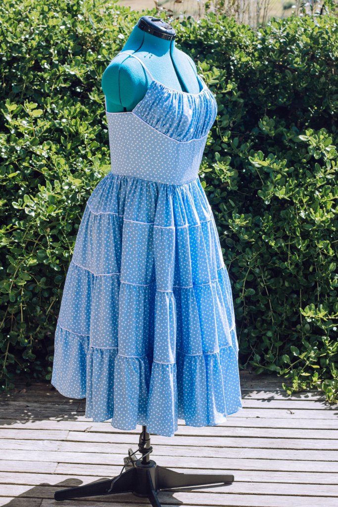 I also changed the skirt again. The pattern has a simple gathered skirt but I wanted all the tiers that Marilyn’s had. So I cut a bunch of rectangles in graduating height and length , gathered them and added pipping in between each of the seams.