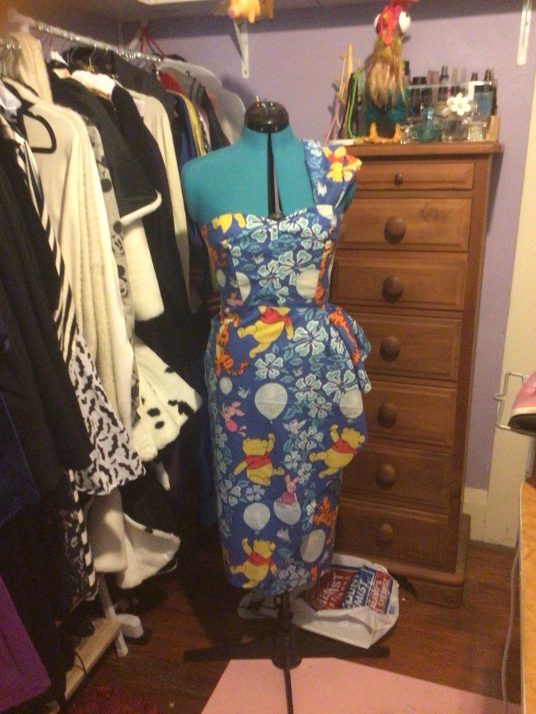 Before that happened though, I was making a sheet dress out of a cute Pooh bear tiki print using Charm patterns l’amour dress. I got so far in fact that all I had left to do was to join the bodice to the skirt and put the zip in the back. I might do that today and then it will be up for sale here in my store.