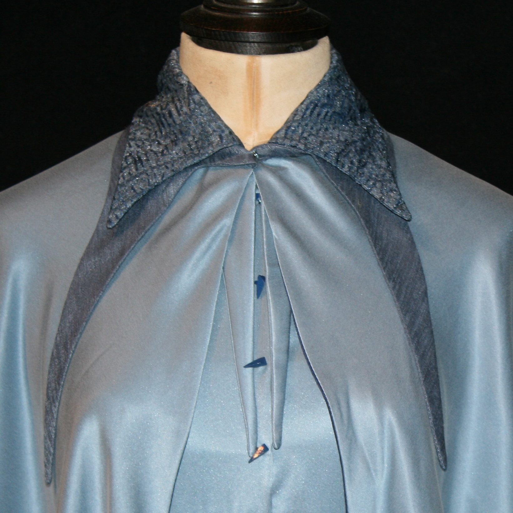 The cuffs are the same style as the ones on the dress only a single layer this time. The collar is the same cut as the one on the dress, but the points point outward from center front like the under collar on the cape.