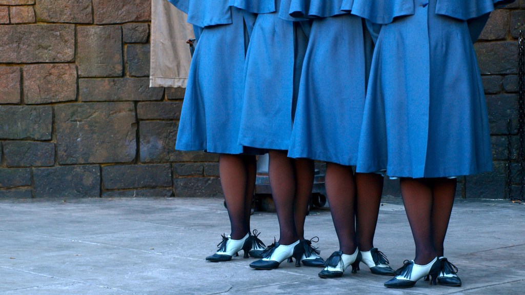 Which leads me to my next observation, the back zip. You can see quite clearly the outline of a zip in the back of the costumes at Universal Studios. I donโt know why theyโve done this when there is a perfectly good seam in the under-arm where they could have put it. I think putting it in the back looks janky and adds unnecessary seams to the back of the skirt and if it does go all the way to the top, with the front buttons being a false closure, then it will also cut the collar in half. UNNECESSARY!