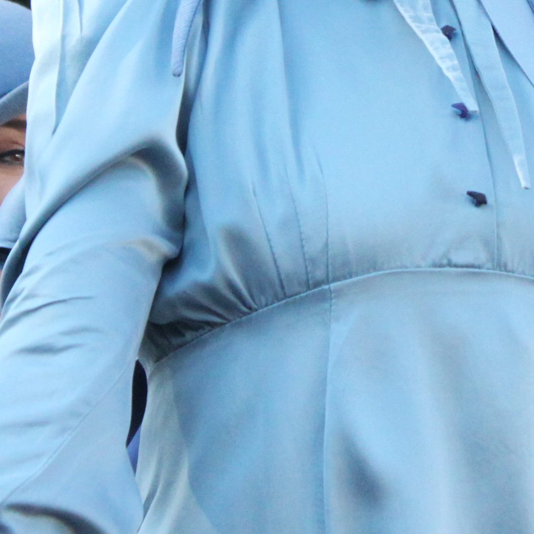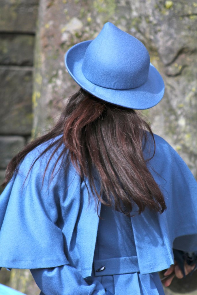 Itโs made from the same light blue fabric as the dress and is trimmed in a dark blue bias which is the same colour as the lining of the skirt/cape.