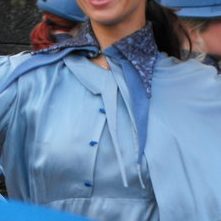 The dress โclosesโ in the center front and has 4 buttons evenly spaced. The buttons are quite small and peculiar in shape. Theyโre lopsided pyramids or squished diamonds, the same colour blue as the lining of the skirt and cape. I estimate the buttons to be no longer than 1.5cm across at their widest point.