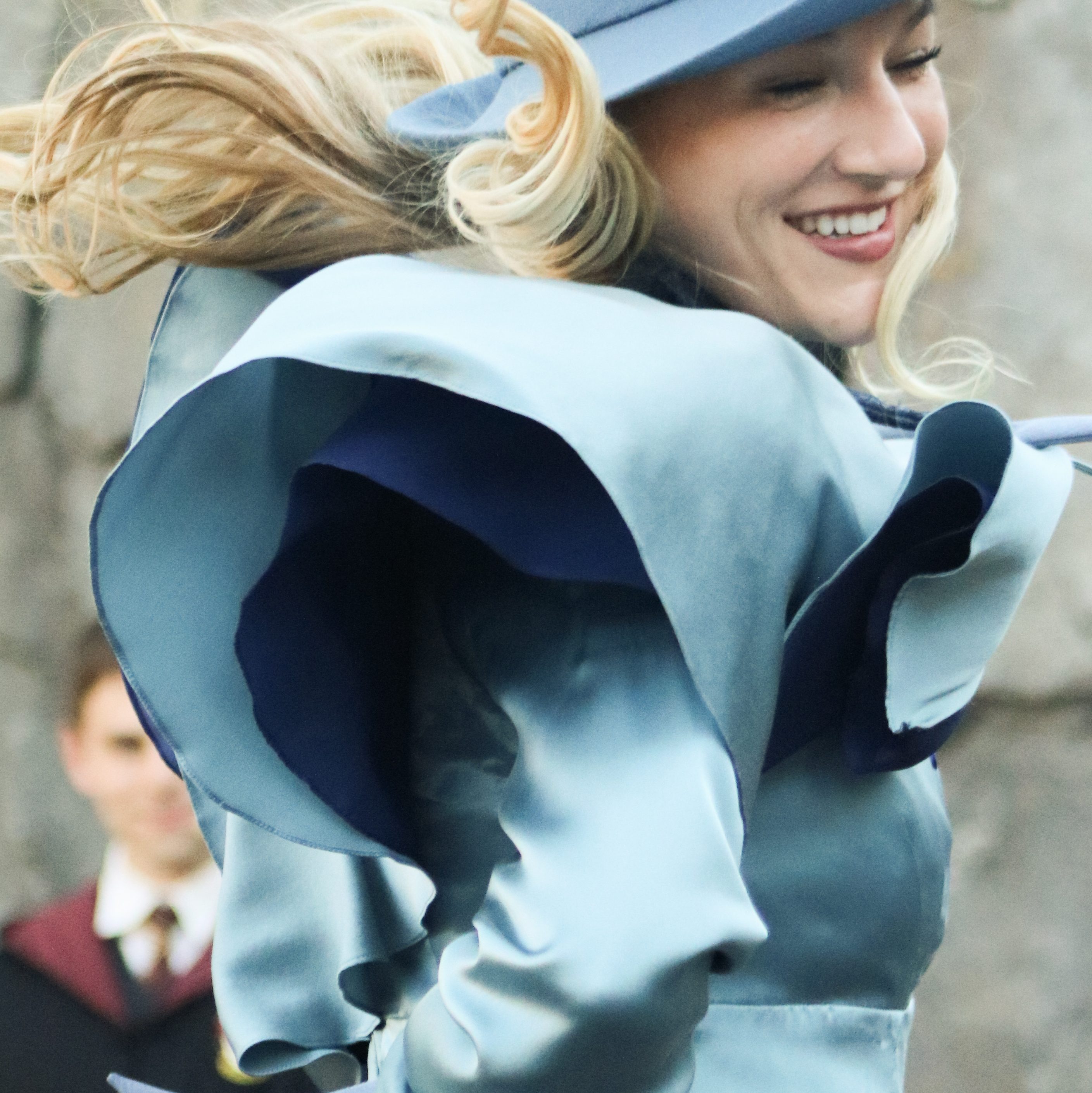 โThe fabric for the Beauxbatons uniforms was deliberately chosen to be ill-suited to the weather at Hogwarts! Though it was out of place, Costume Designer Jany Temime also knew “that wild, silky light blue, which moved so well, would stand out and catch the boys’ eyes.โโ