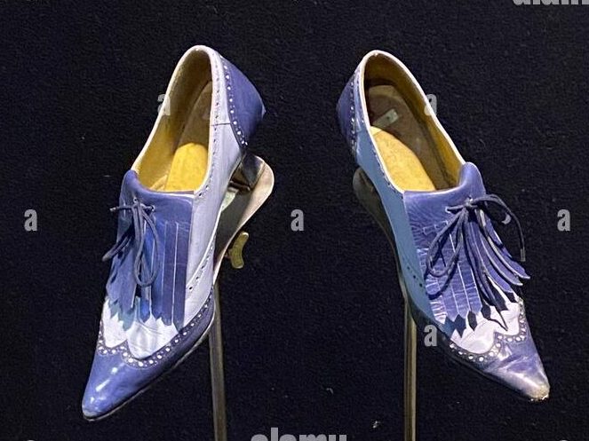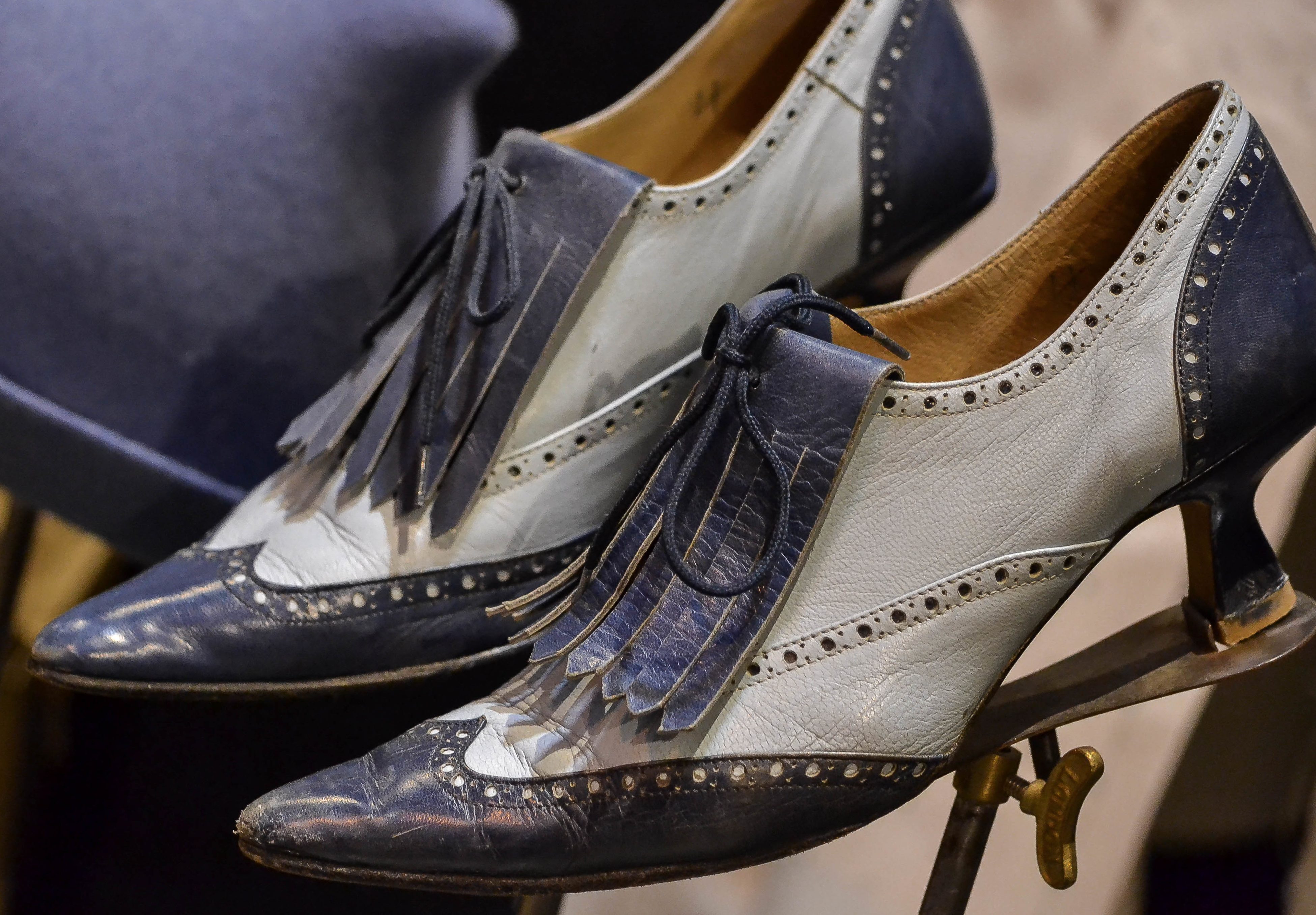 Pointed toe Oxford style shoes. The main part of the shoe is a light blue leather with the toe, tongue and heel being a dark blue leather. The heel has a very 1930s shape to it and isnโt very high probably around 5cms high.