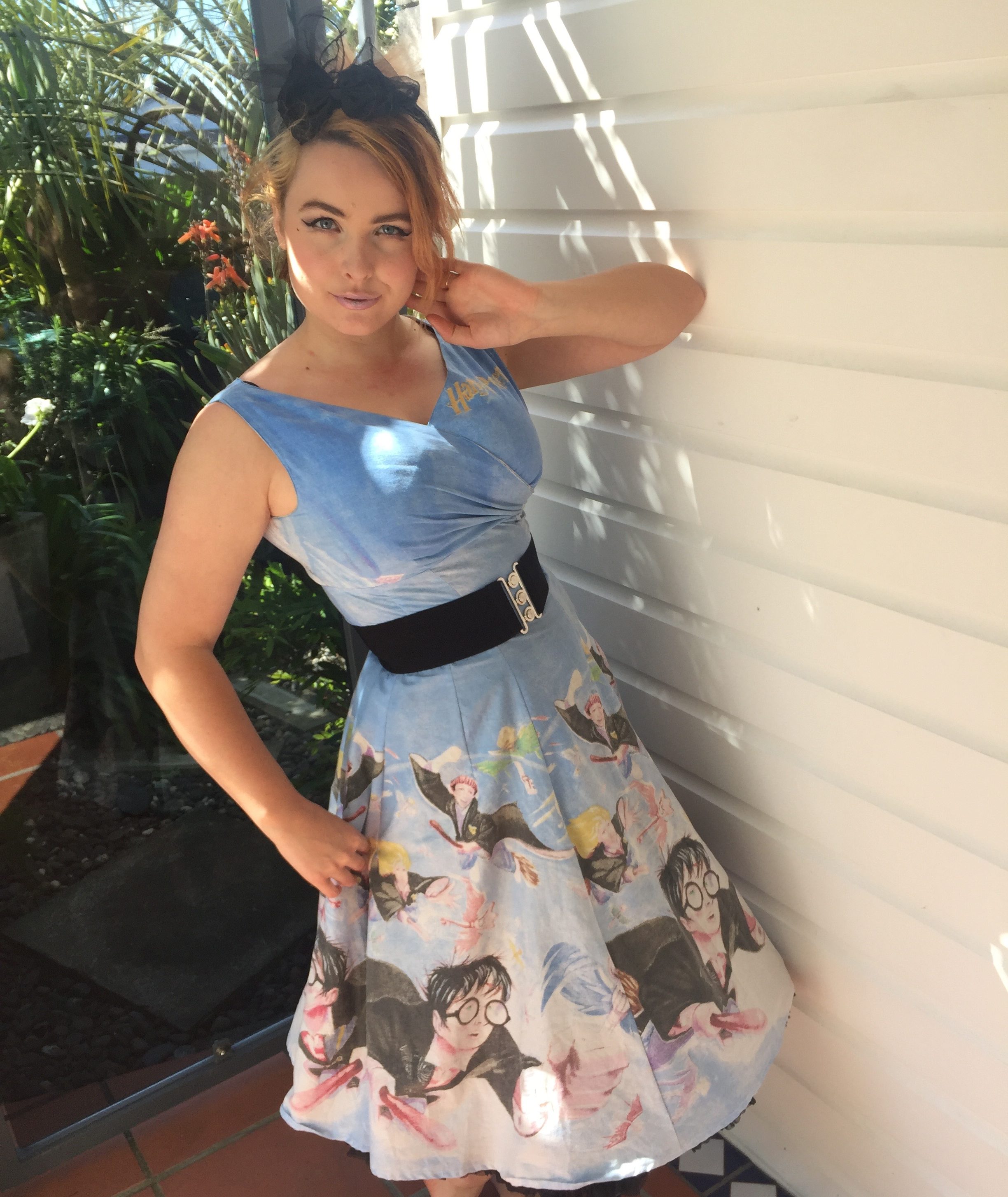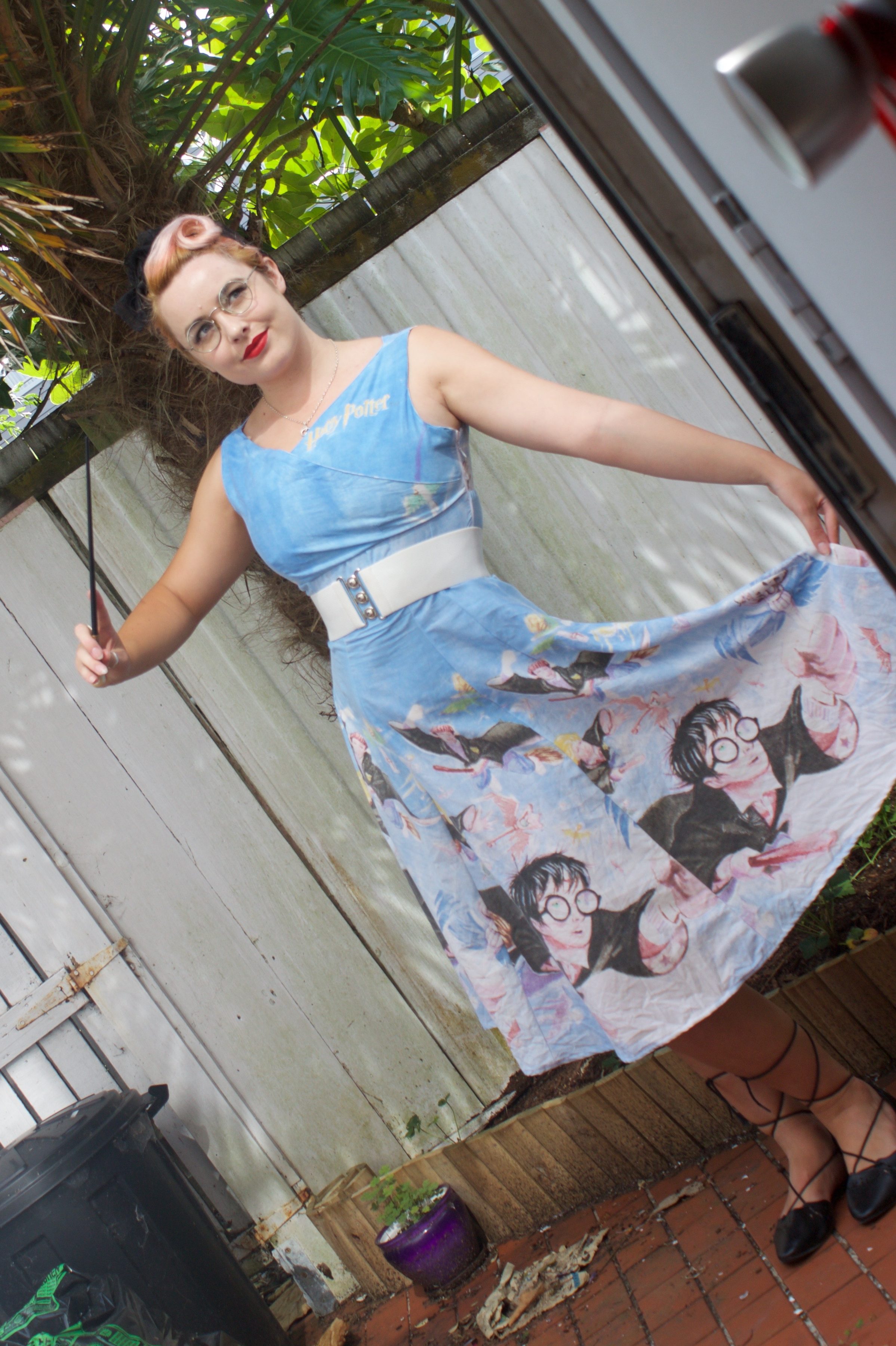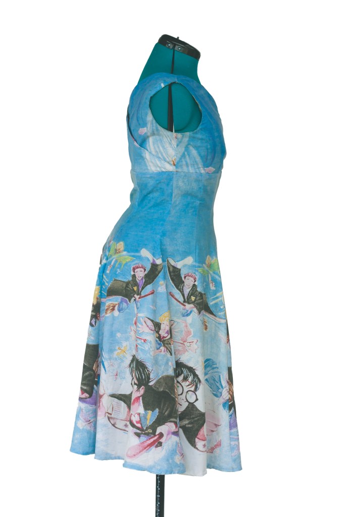 I put the pattern pieces over the print, so the gang would sit along the bottom of the skirt of the dress and act like a border. For the bodice, I put the pieces over any bits of the blue sky I could find, with the exception of the left breast piece, which I thought would look cool with the Harry Potter logo on it.