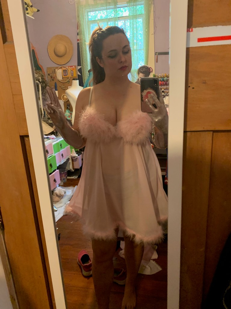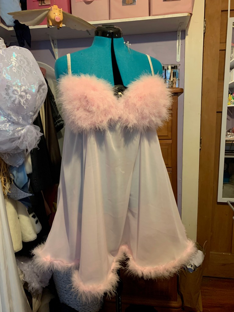 For the โdressโ part I was really excited to be making it from an authentic 1960s slip pattern. I only ended up using the front and back pattern pieces which I made from the pink chiffon and sewed the two sides together. I then glued it to an old bra and hid the glue by sewing a row of the pink foil fabric to the band and gluing the feathers to the bust. After trying the dress on for the first time, I realised it was far to revealing for my tastes so I added a panel to the top of the bra with more feathers for a little bit more modesty. I took about six inches off the hem, overlocked the edge and glued a row of feathers to it. I stepped back and realised it needed another row to make it even more fluffier.