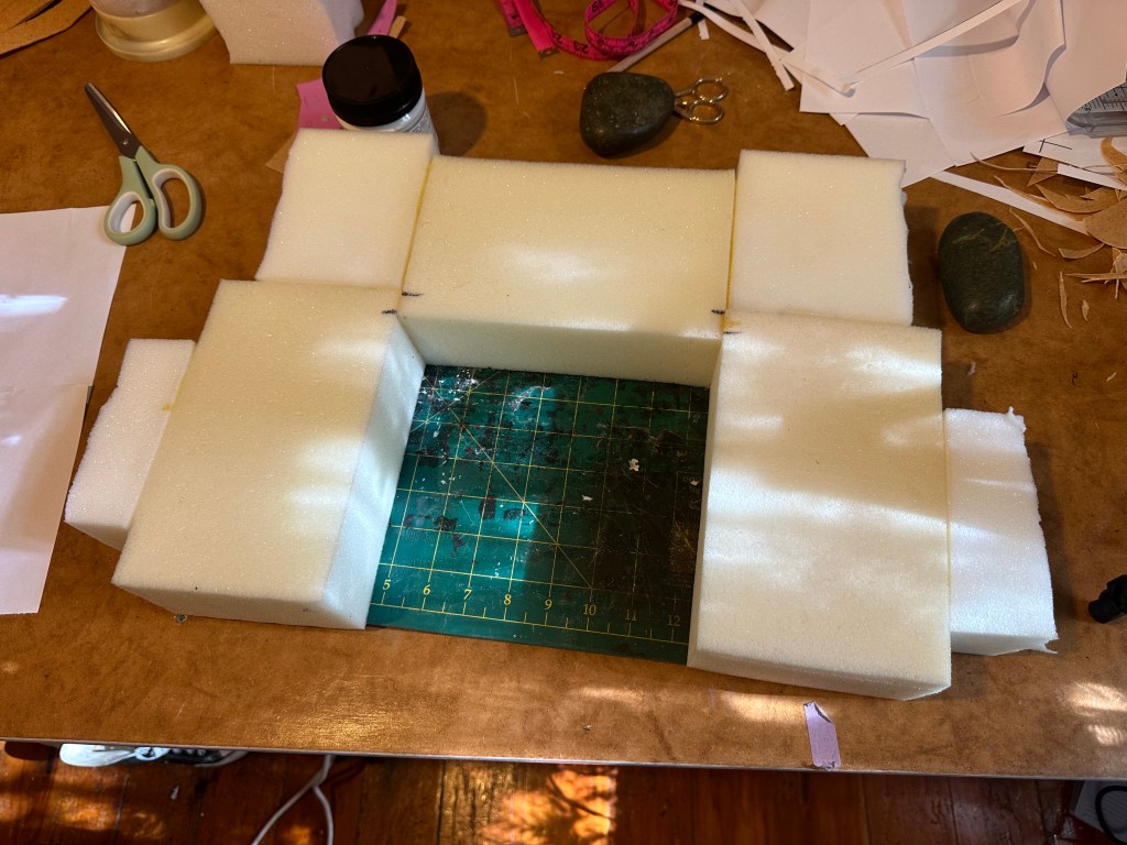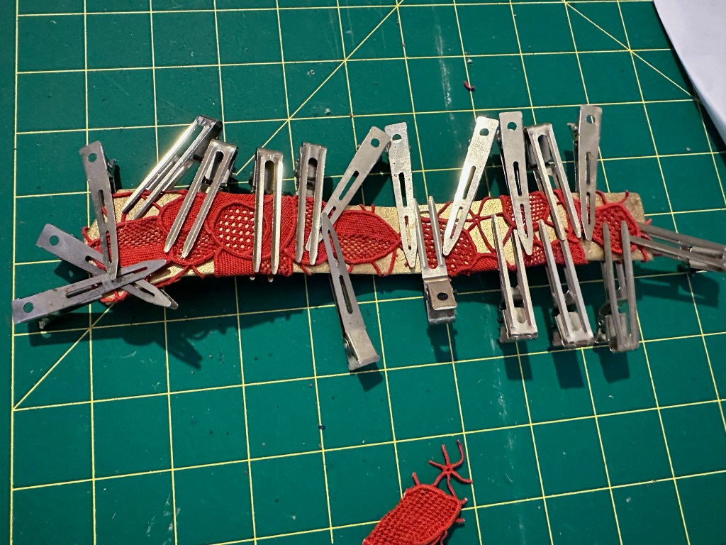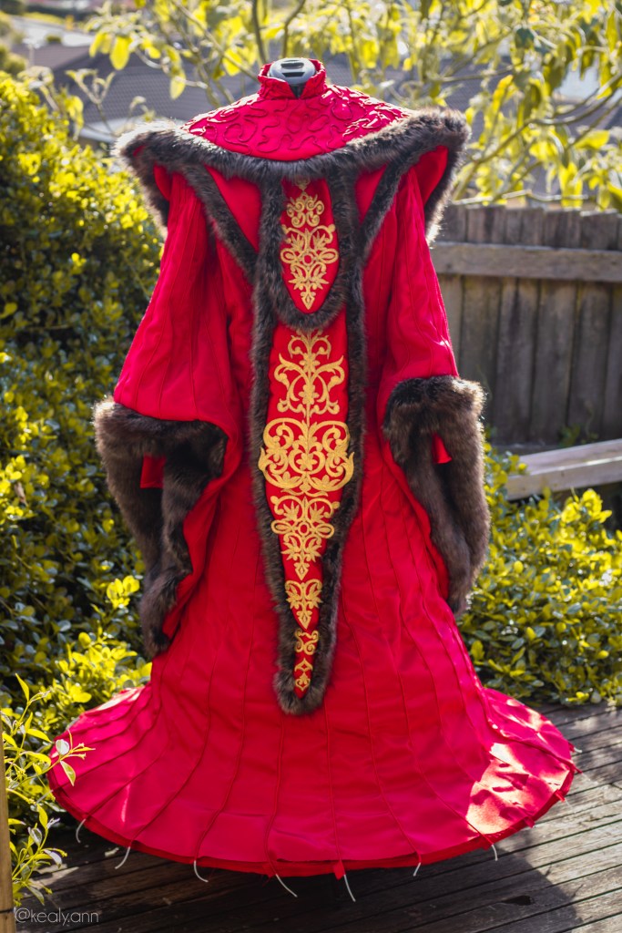 The dress and outer sleeves are made from Bengaline, lined and trimmed with a faux fur. There are 16 panels in each sleeve and 24 in the dress. Each of the seams contain a self-made satin pipping too (around 100m total went in to the dress).