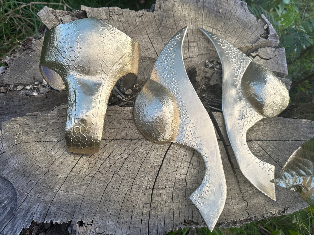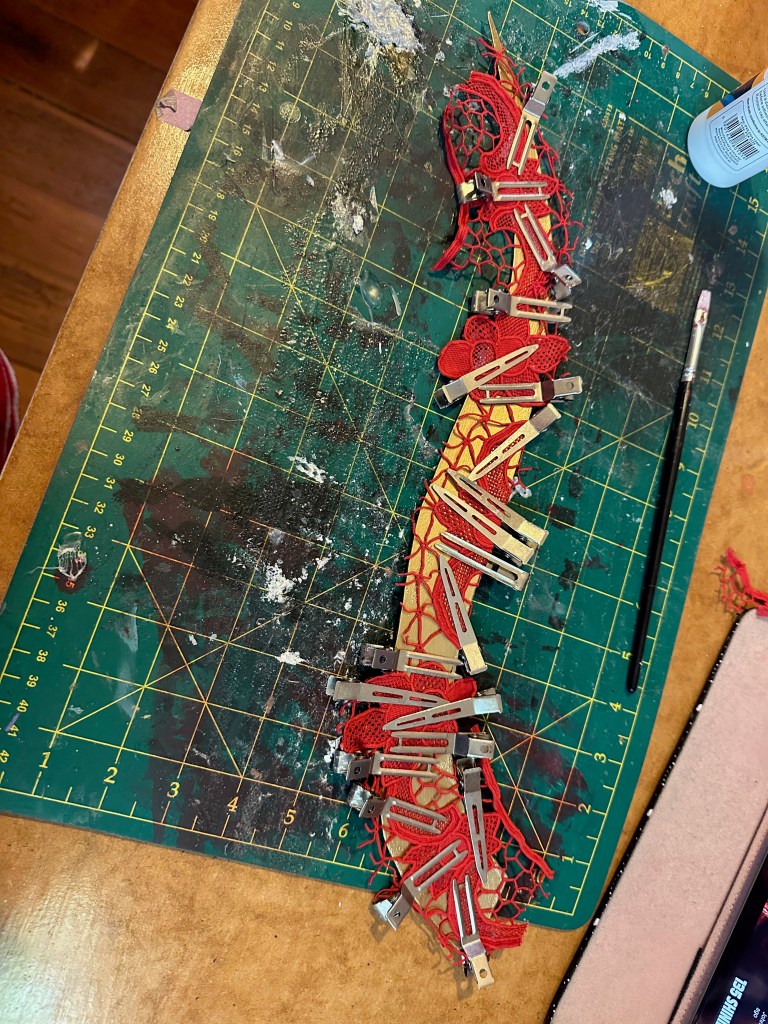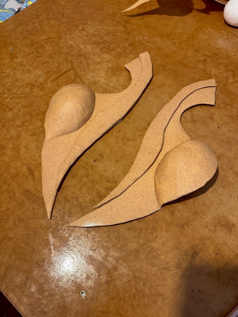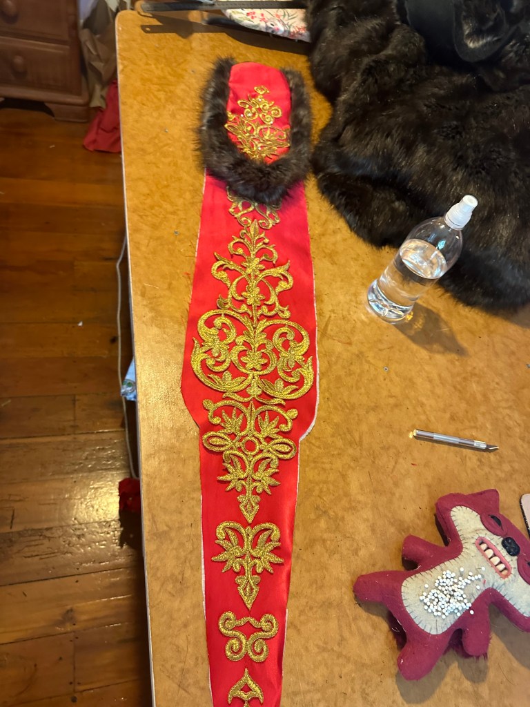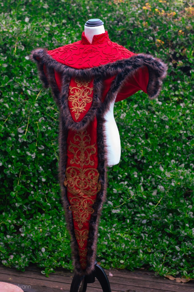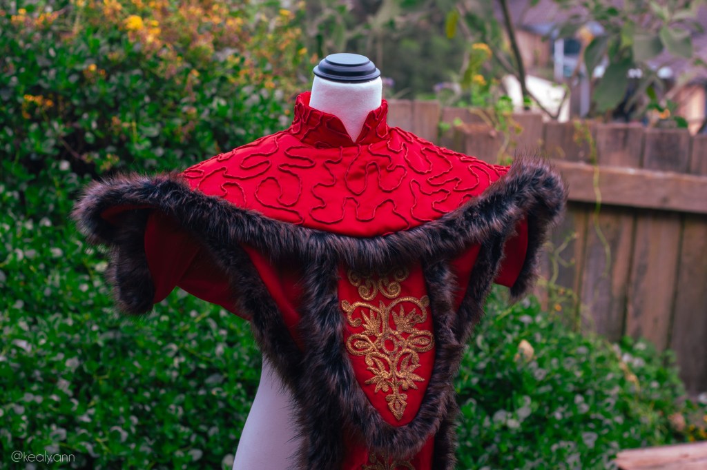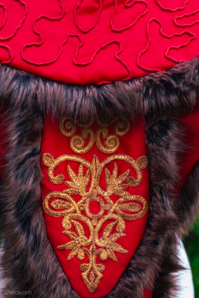 The collar pieces and tabard are made from the same satin as the inner sleeve and pipping and trimmed in the faux fur. The top collar piece has a batting layer with boning in the shoulder points to help it keep its shape and has cording hand stitched on the top.