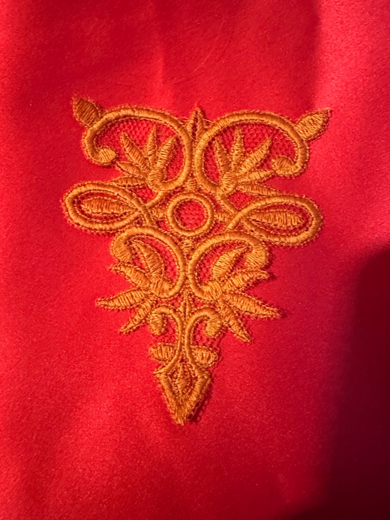 The gold design on the tabard was done using my embroidery machine onto tulle and hand- appliquรฉd to the satin.