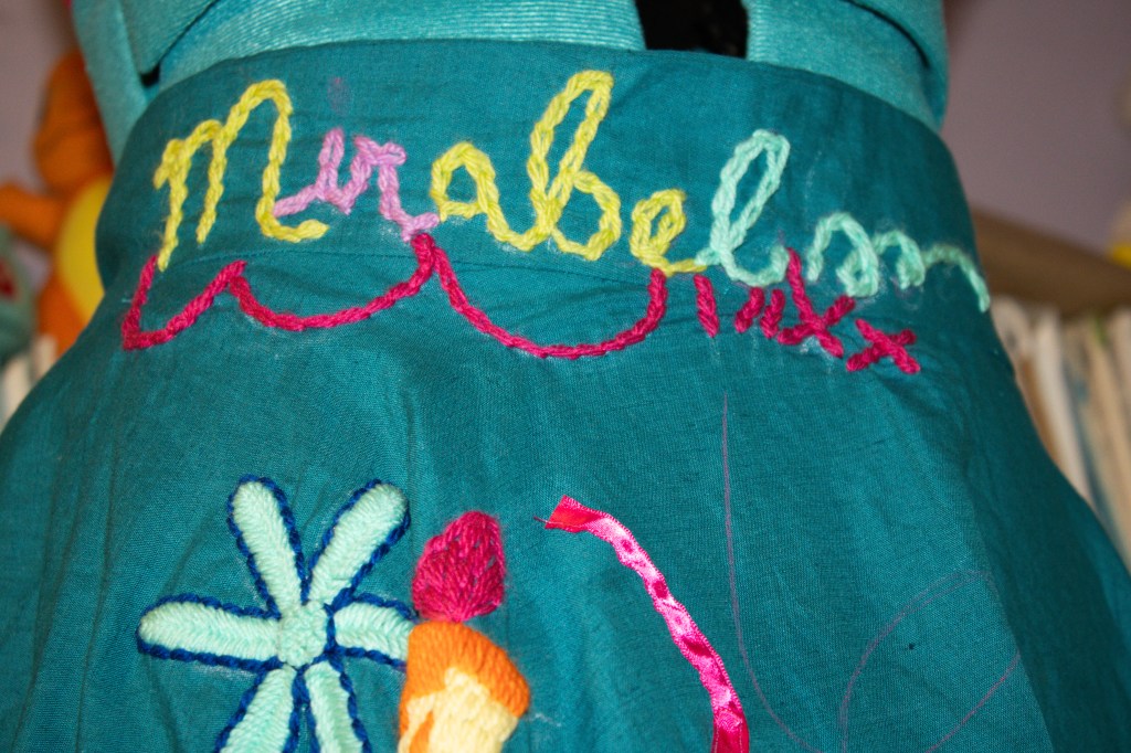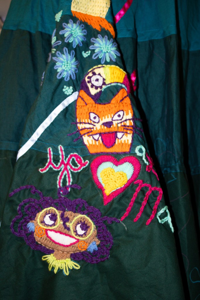 On the inside of the skirt, I lined it with a blue cotton fabric (which was made in to a simple circle skirt). The lining layer was hemmed with blue eyelet lace that I had also dyed myself using the same Rit dye as the tassel trim. This layer is currently hand tacked in to the waistband so I can easily remove it and finish the embroidery on the skirt.