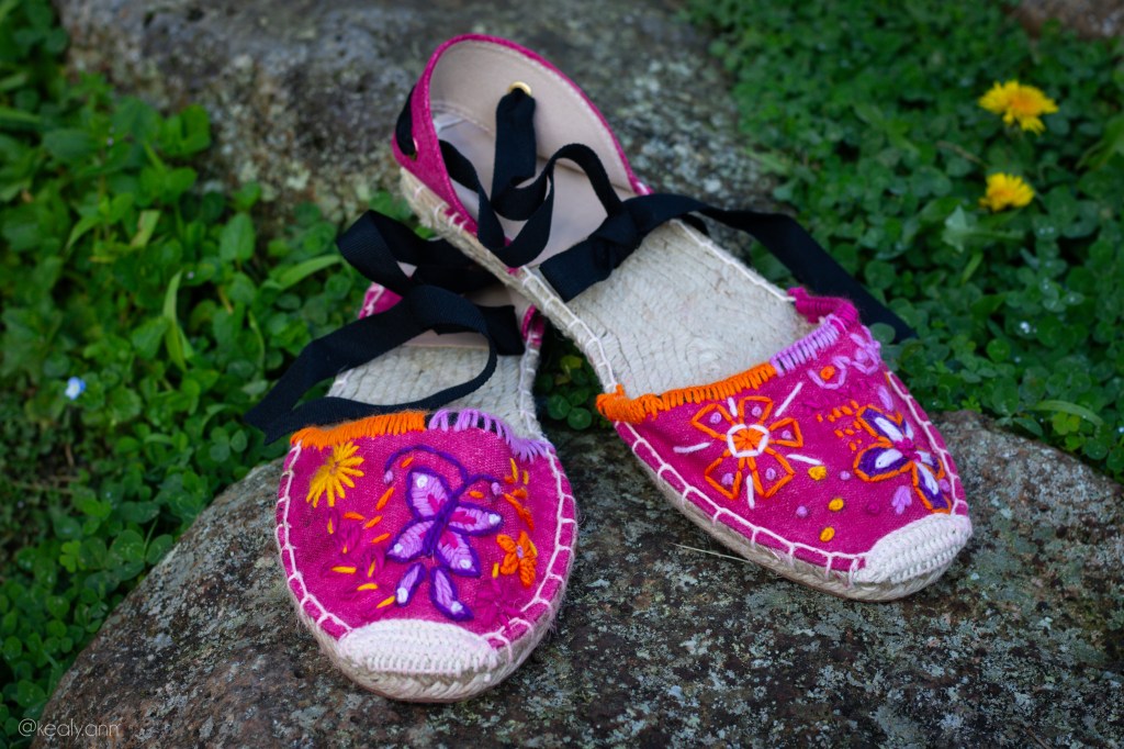 Shoes – I purchased a hemp rope white canvas shoe base off of Ali Express. First I colored the white canvas magenta using alcohol markers. I then embroidered the designs on the toes of the shoe using yarn.