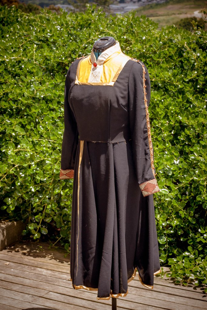 Finally the skirt got sewn to the bodice and I added a decorative red and gold button to the collar.