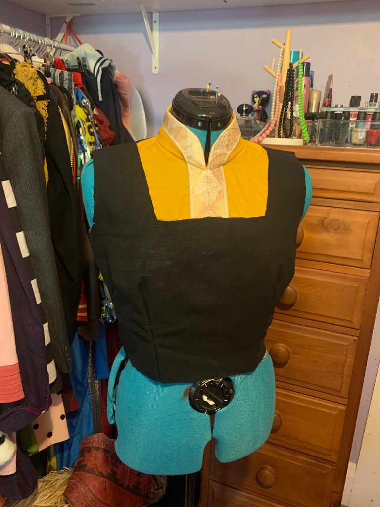 I then added the decorative pieces to the bodice, such as gold bias tape to the neckline and some cut up floral, gold trim and a couple of buttons to form the flower piece in the center. Then the bodice got tacked to the undershirt at the center back and waist and sewn/overlocked at the sleeves.