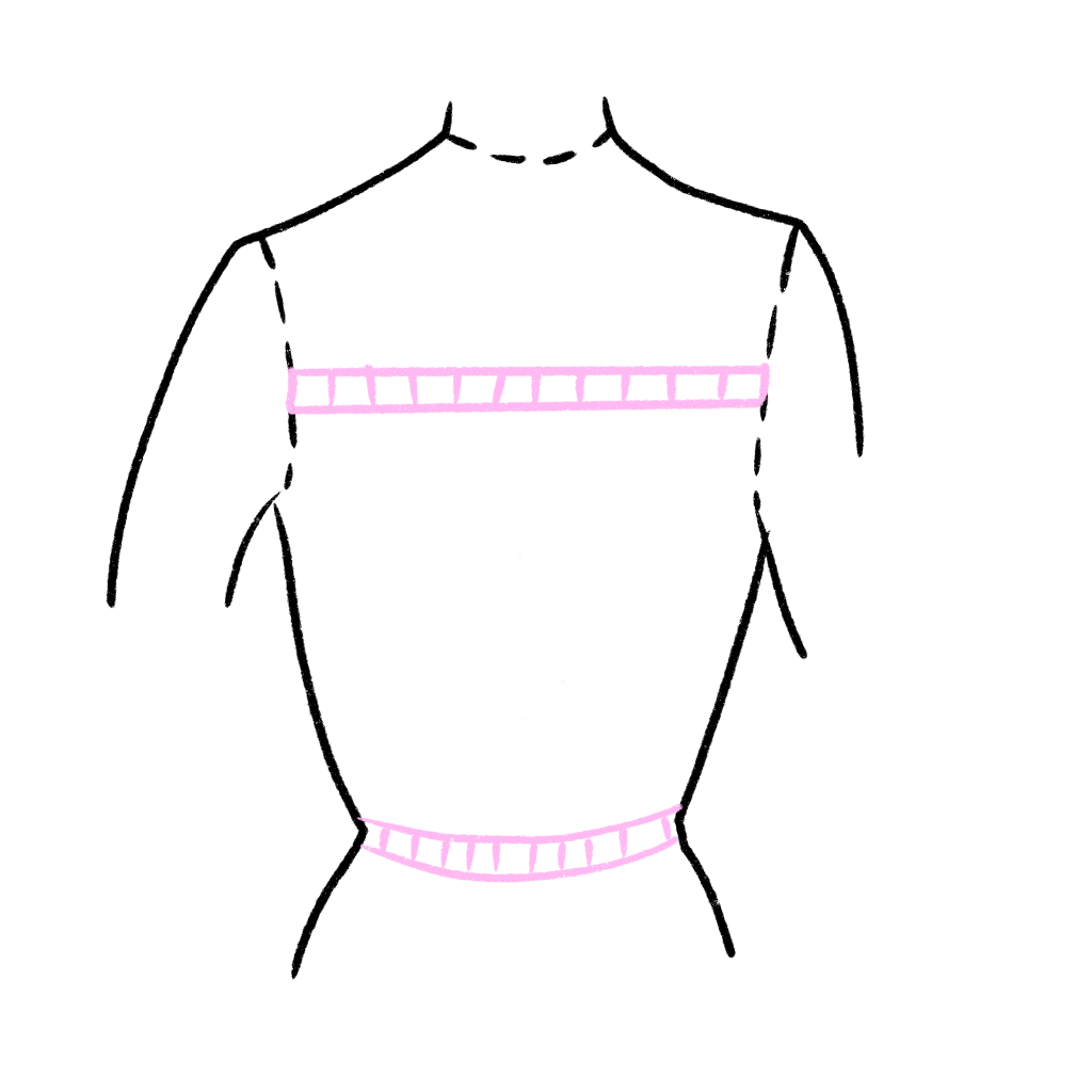 Fairly loosely round fullest part of the bust and across shoulderblades.